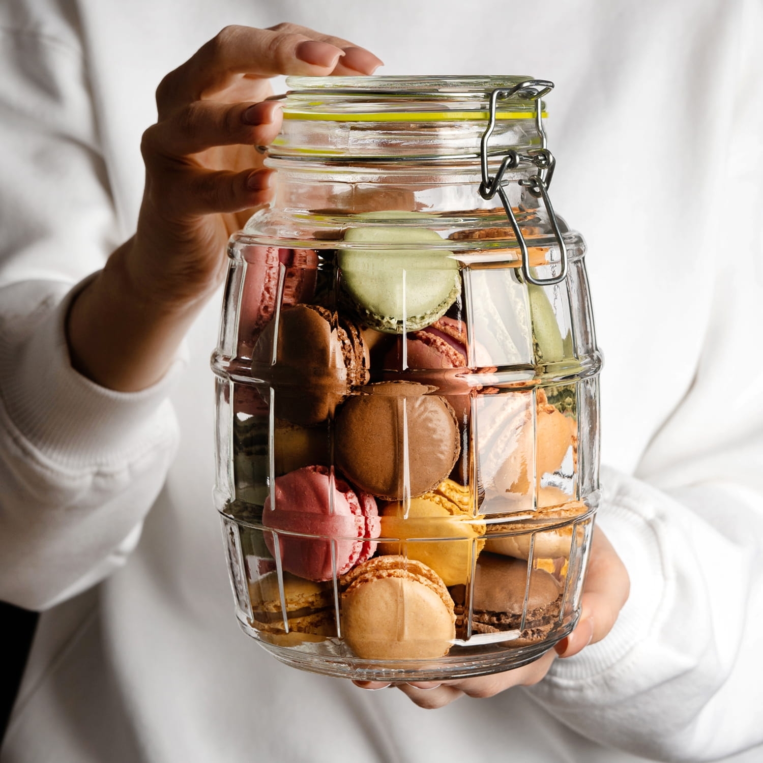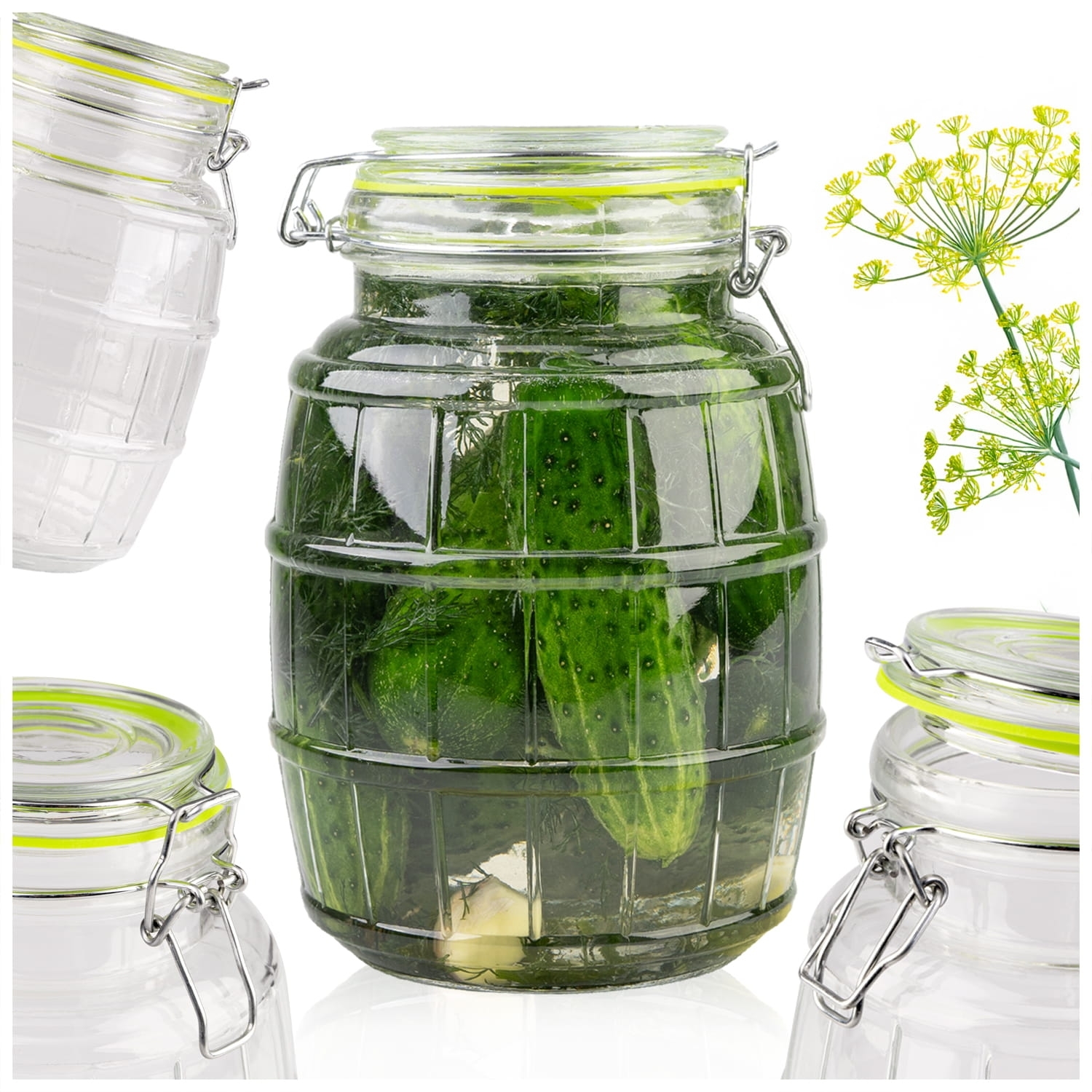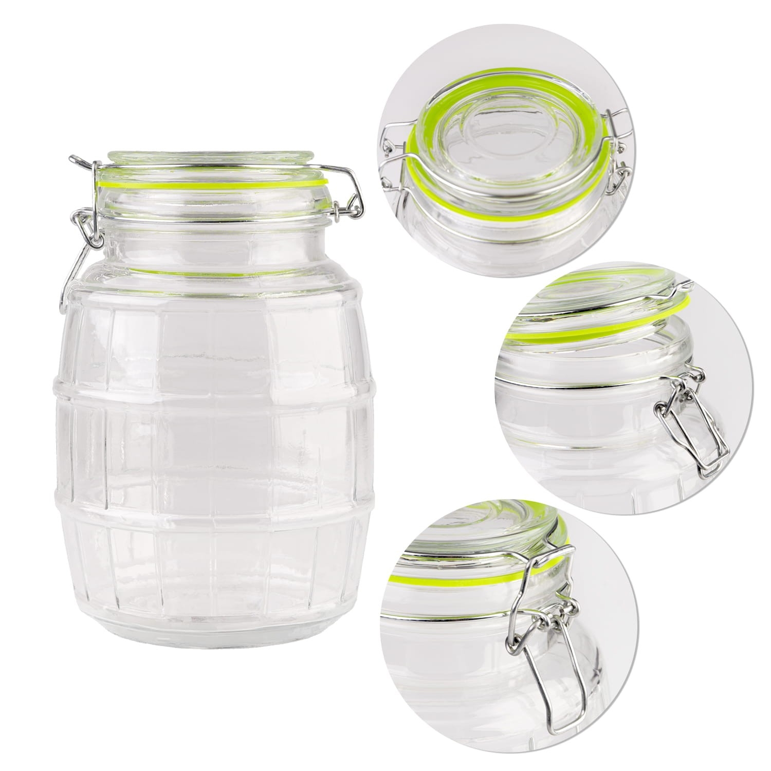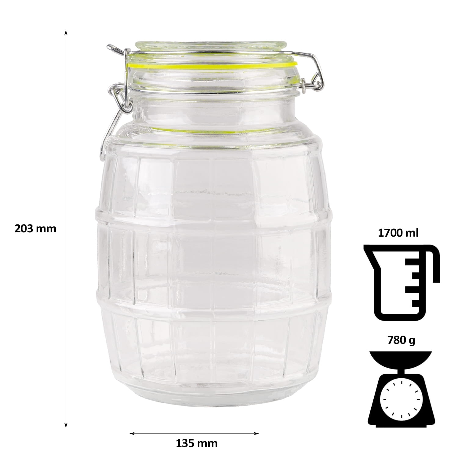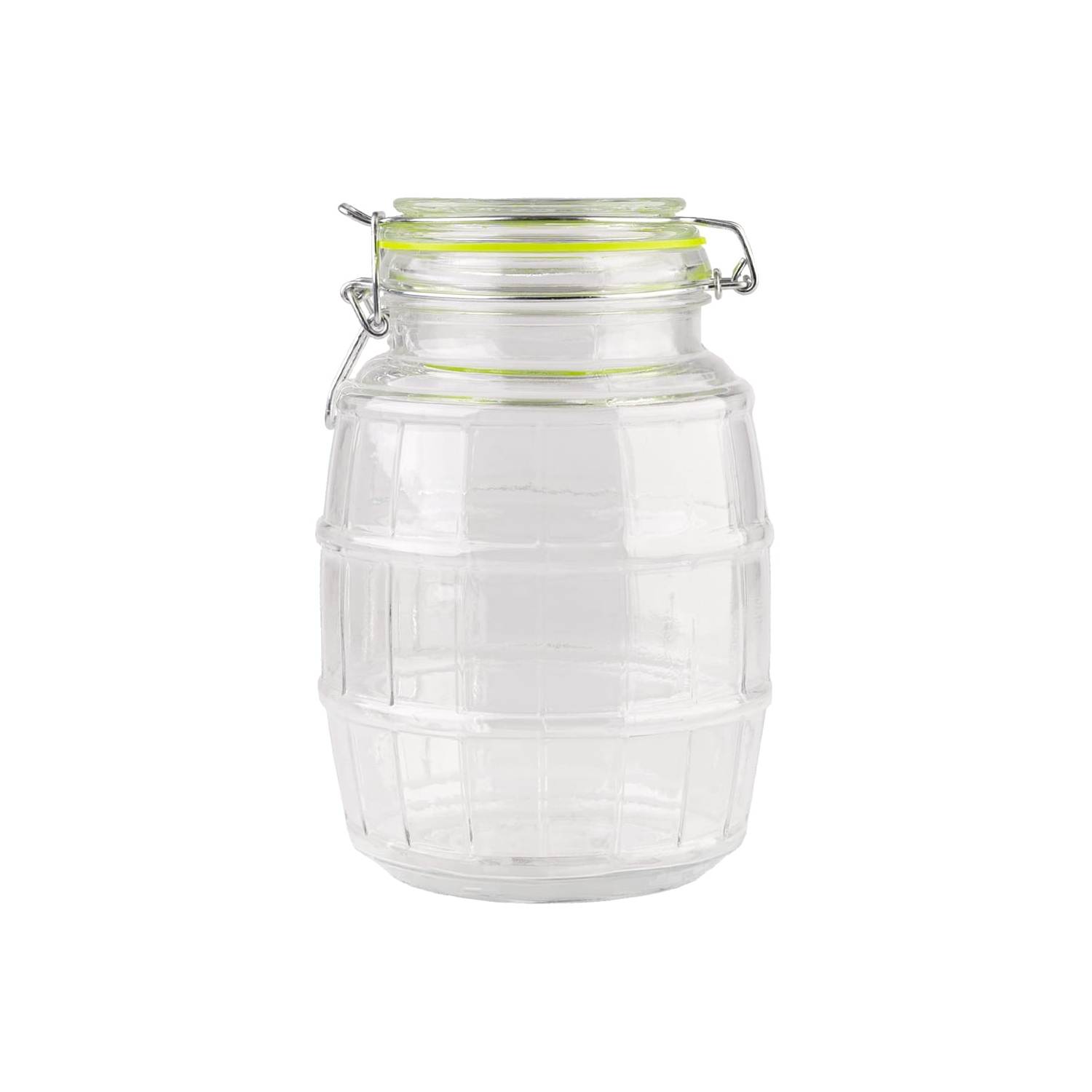 Dóza z kvalitního skla kombinuje funkčnost a elegantní design s drážkovaným povrchem ve tvaru soudku. Využijete ji na mouku, cukr, rýži, kávu, čaj či těstoviny, ale také při domácím nakládání a kvašení.