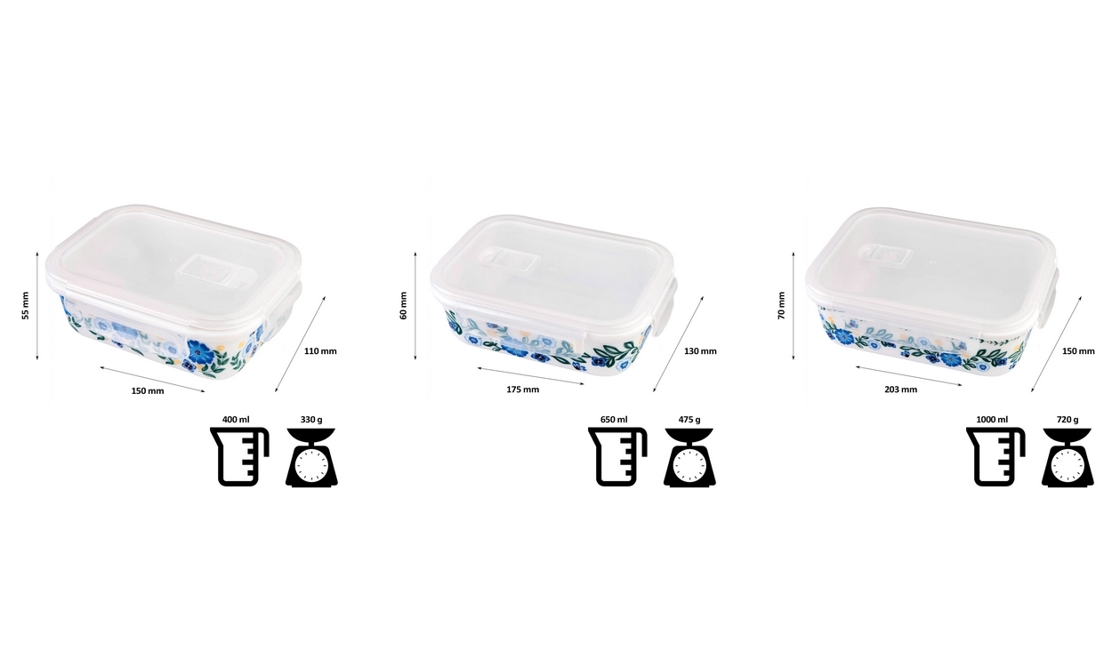 Stylová hranatá skleněná dóza s objemem 400 ml, 650 ml a 1000 ml je praktickým a dekorativním řešením pro uchování potravin. Spolehlivě chrání skladované produkty a zároveň přináší estetický prvek do vaší kuchyně díky jemnému modrému květinovému motivu.