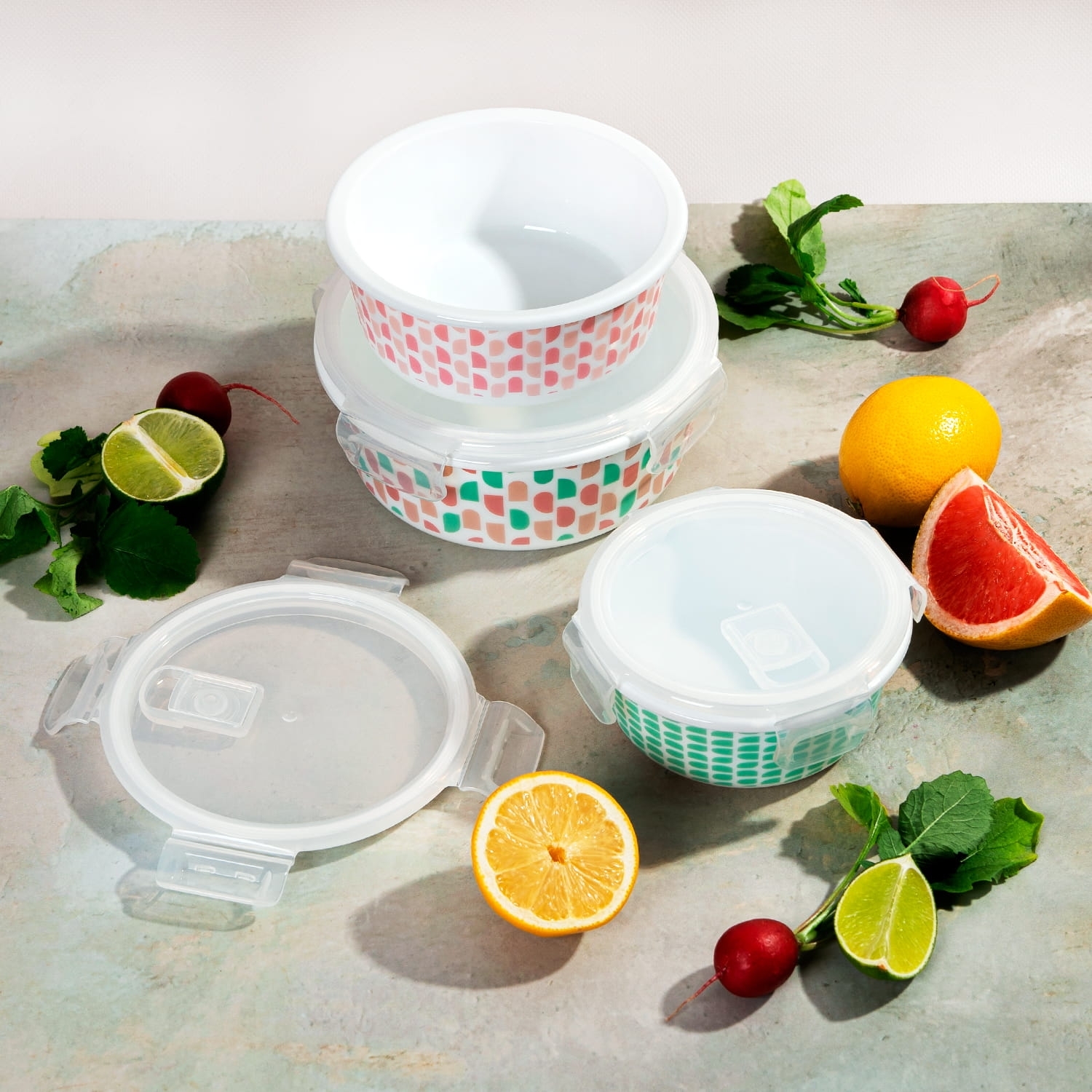 Dózy jsou vyrobeny z kvalitního, teplotně odolného opálového skla, které je vhodné pro použití v lednici, mrazničce, mikrovlnné troubě (bez víka) a myčce nádobí. Víka s klipy a ventilem zajišťují těsné uzavření a pohodlné použití. Moderní ornamentální design v růžovo-zelené barevné kombinaci dodá vaší kuchyni stylový nádech.