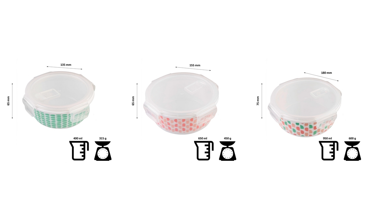 Praktická sada tří kulatých hermetických skleněných dóz o objemech 400 ml, 650 ml a 950 ml je ideálním pomocníkem pro každodenní skladování, ohřívání i servírování potravin. Díky odolnému opálovému sklu a víkům s klipy zůstávají pokrmy čerstvé a bezpečně uložené doma i na cestách.