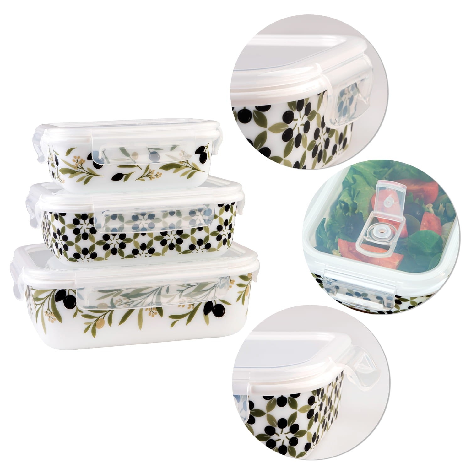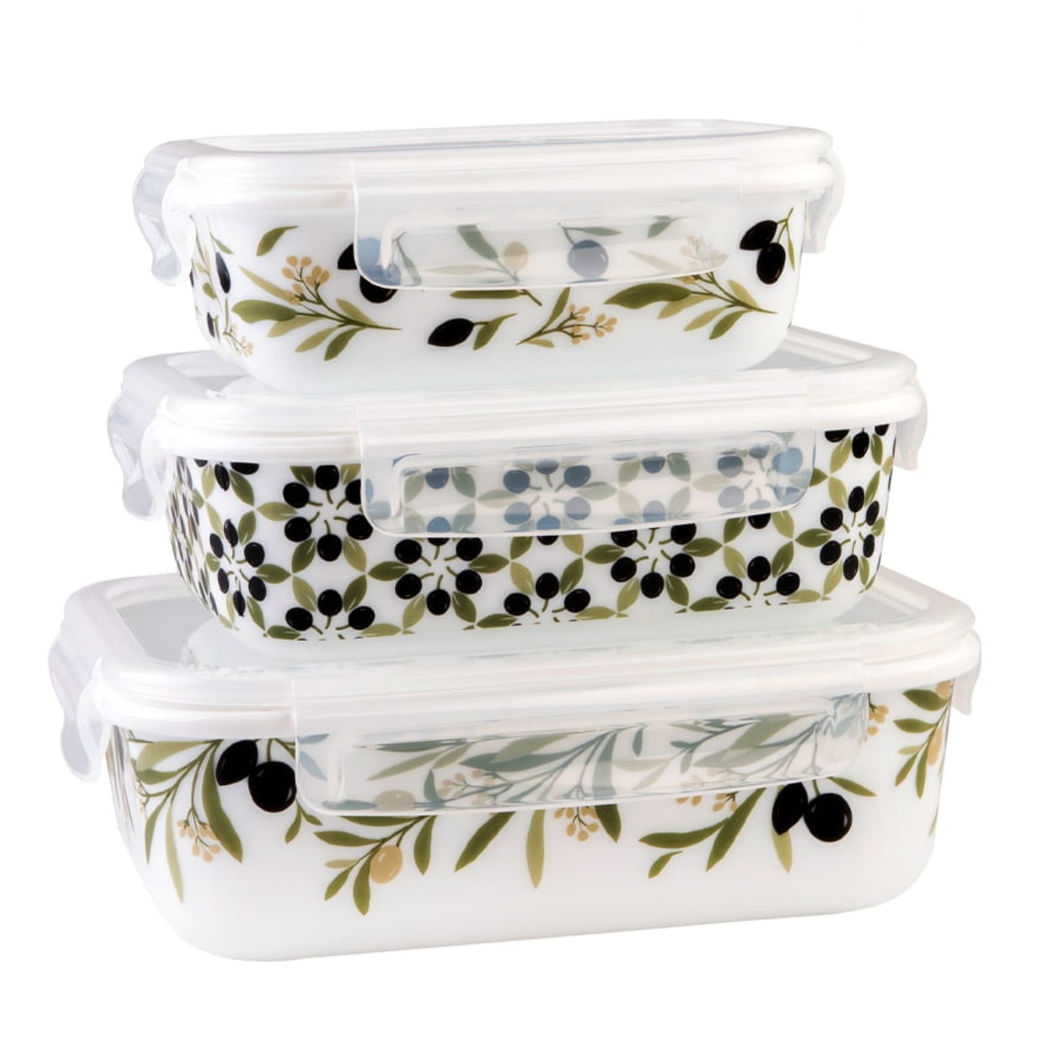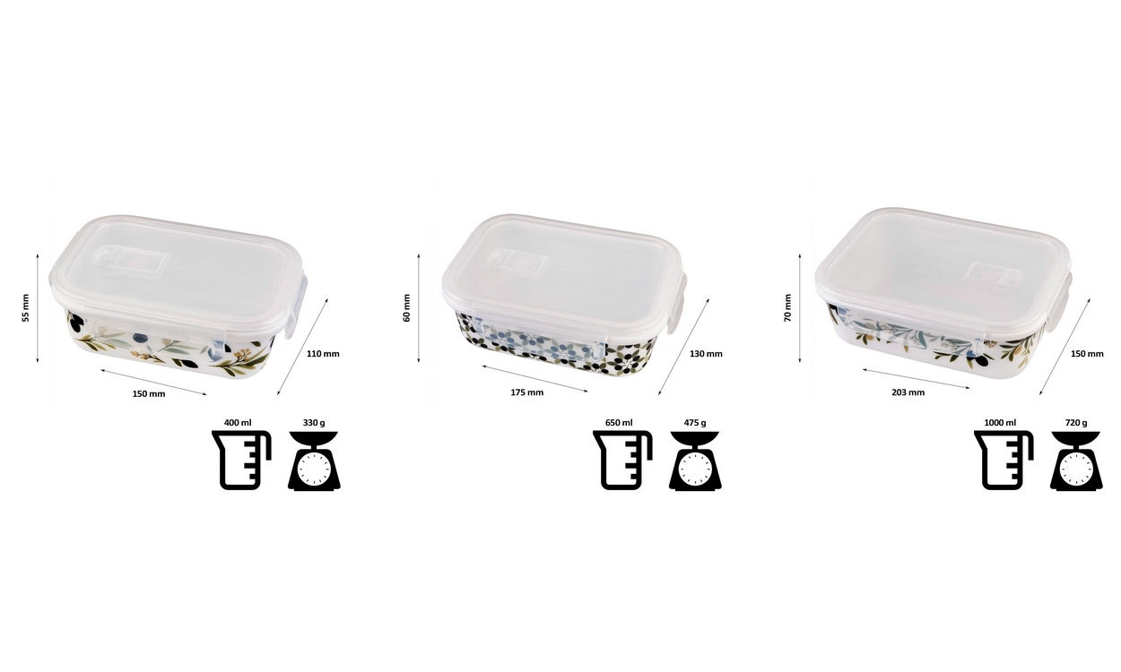 Stylová sada tří opálových skleněných nádob s motivem oliv je praktickým a dekorativním řešením pro každou kuchyni. Spolehlivě uchovává potraviny čerstvé a zároveň dodává prostoru estetický vzhled.