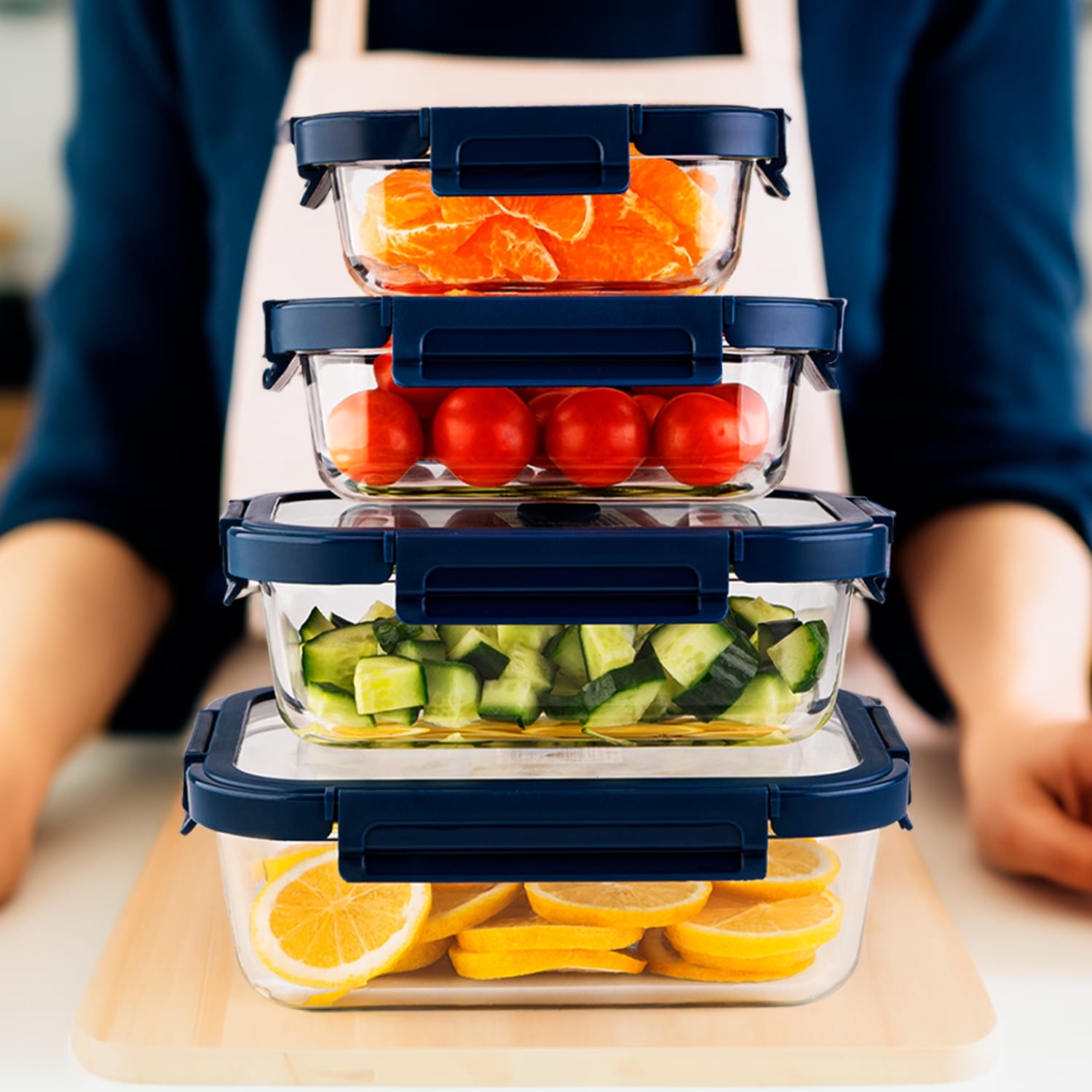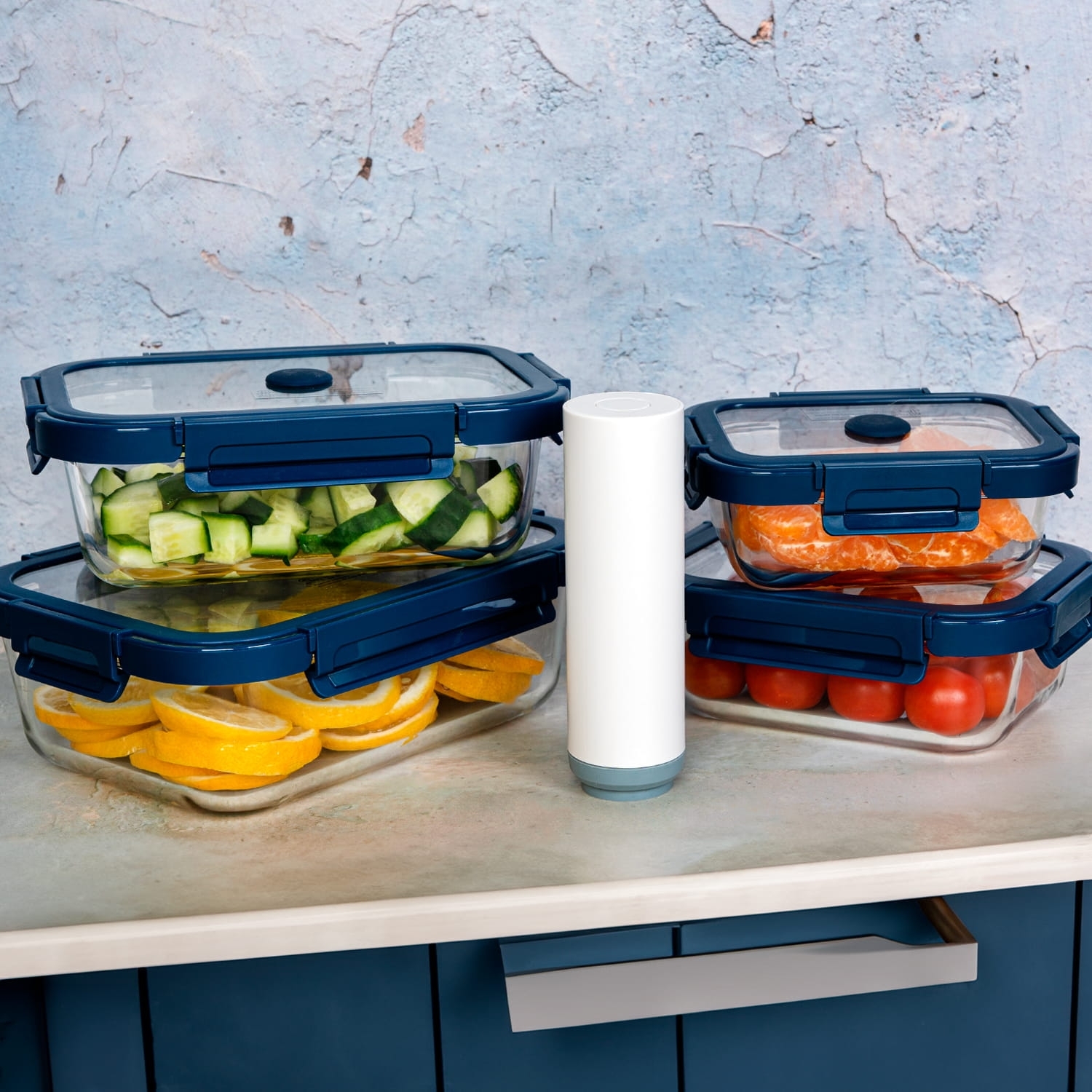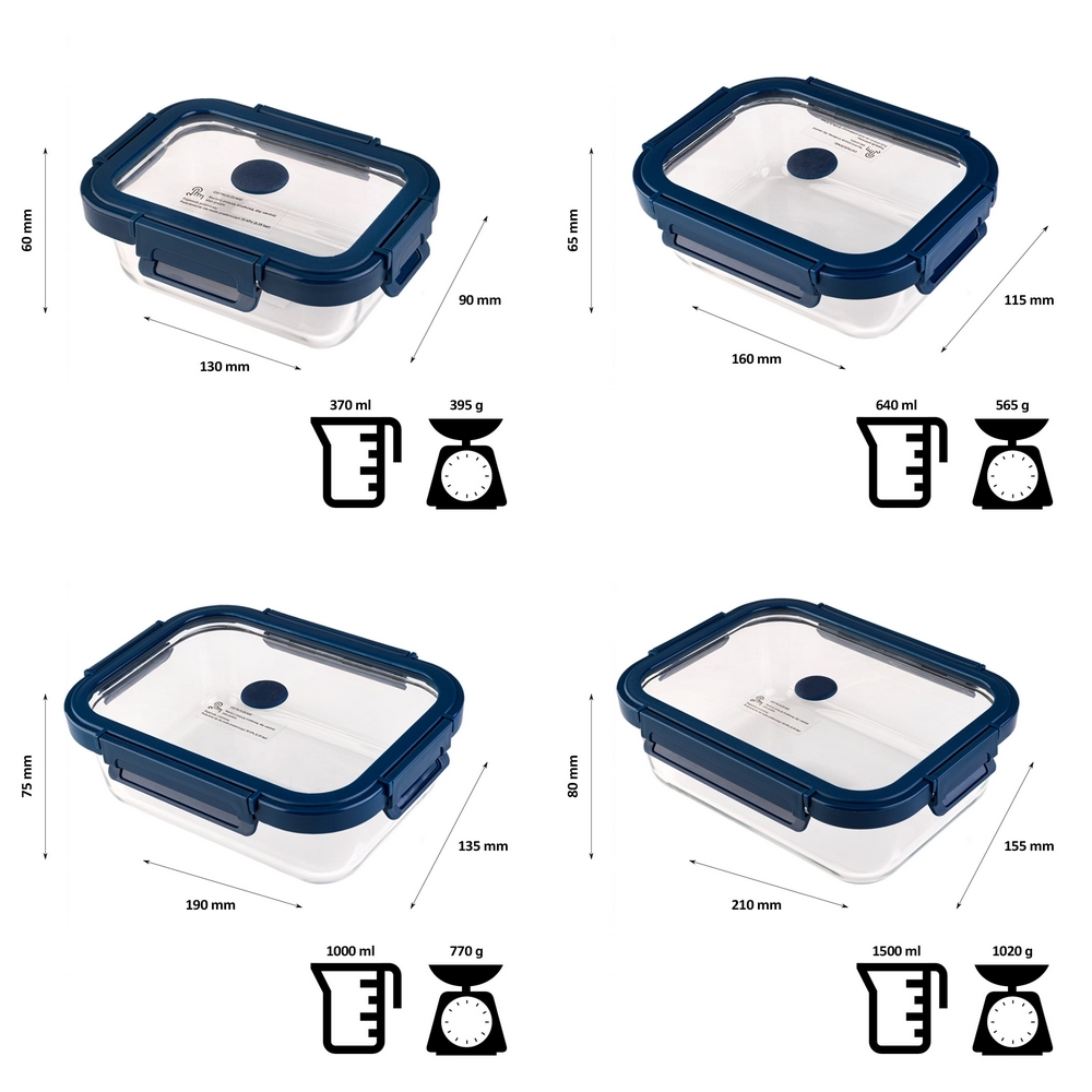 V sadě najdete 4 praktické dózy různých objemů (370 ml, 640 ml, 1000 ml a 1500 ml) a elektrické vakuové čerpadlo. Dózy jsou vyrobeny z odolného, vysoce kvalitního skla a opatřeny těsným vakuovým víkem. Jsou vhodné pro mražení, ohřev v mikrovlnné troubě a troubě (bez víka do 120 °C) i mytí v myčce nádobí. Obdélníkový tvar umožňuje snadné skladování doma, v lednici, v batohu nebo tašce. Perfektní pro jídlo do práce, do školy, na cesty i pro domácí kuchyňské použití.