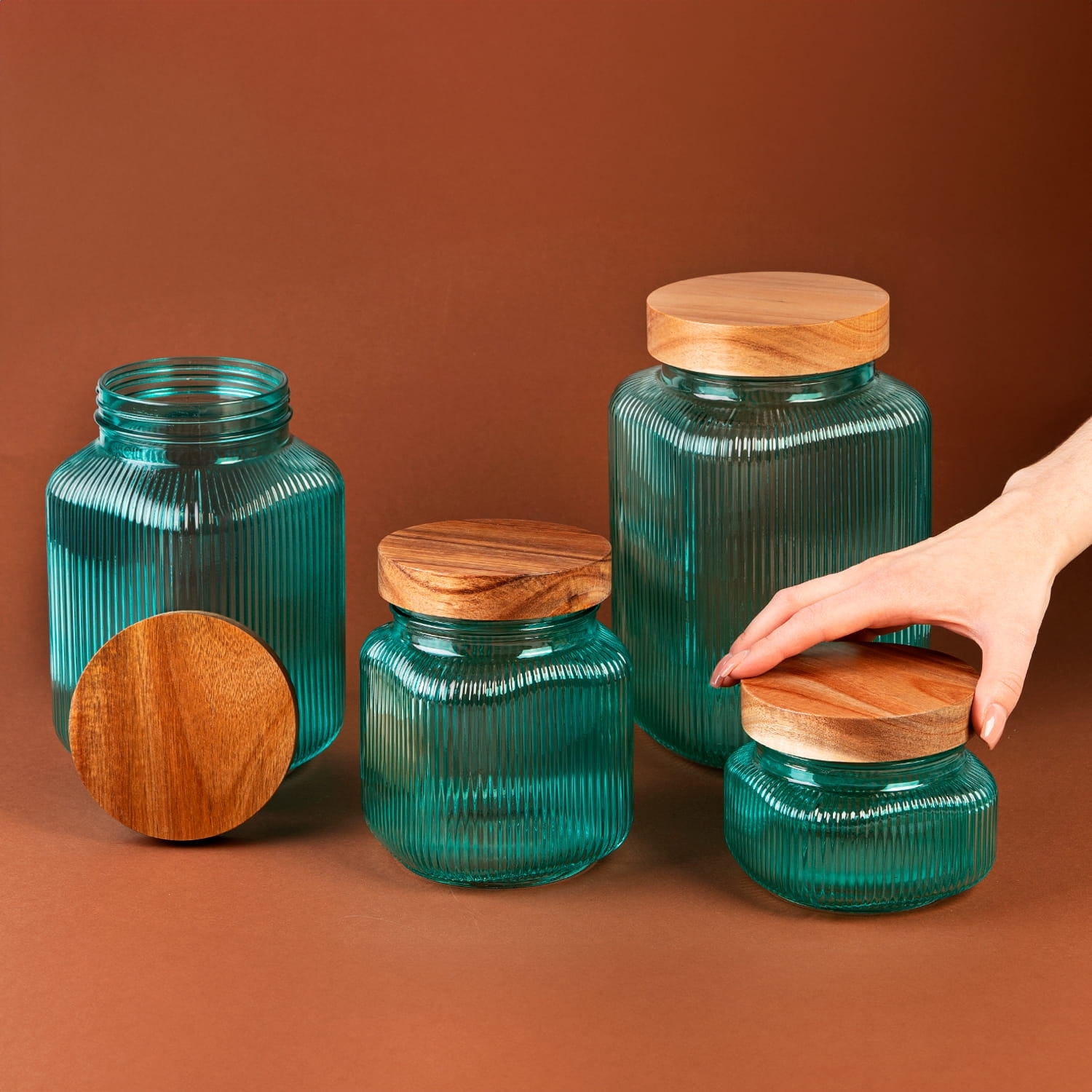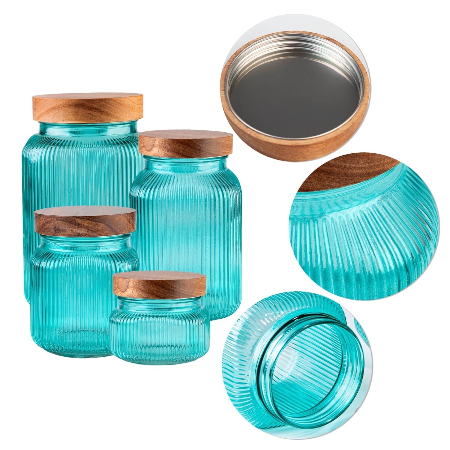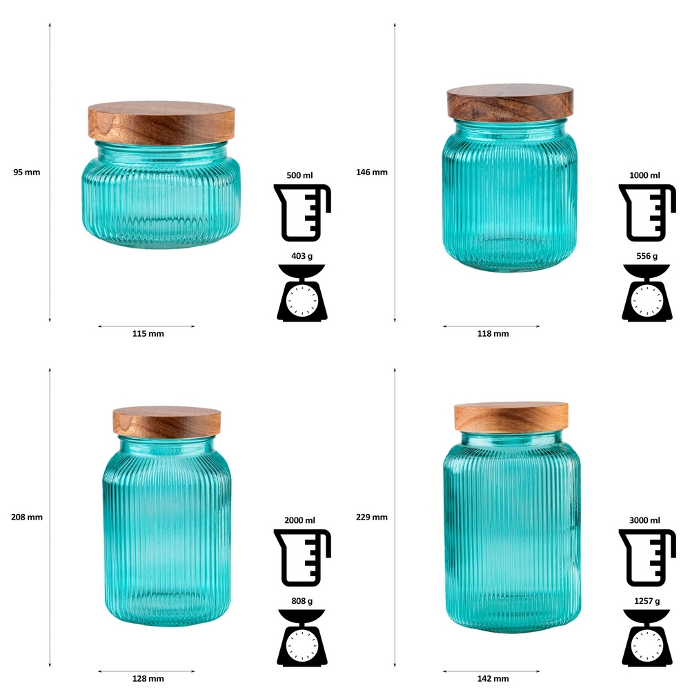Sada čtyř tyrkysových skleněných dóz s dřevěnými šroubovacími víky je perfektním řešením pro přehledné a stylové uskladnění potravin. Drážkovaná textura skla v kombinaci s přírodním dřevem vytváří moderní a nadčasový vzhled, který se hodí do každé kuchyně.