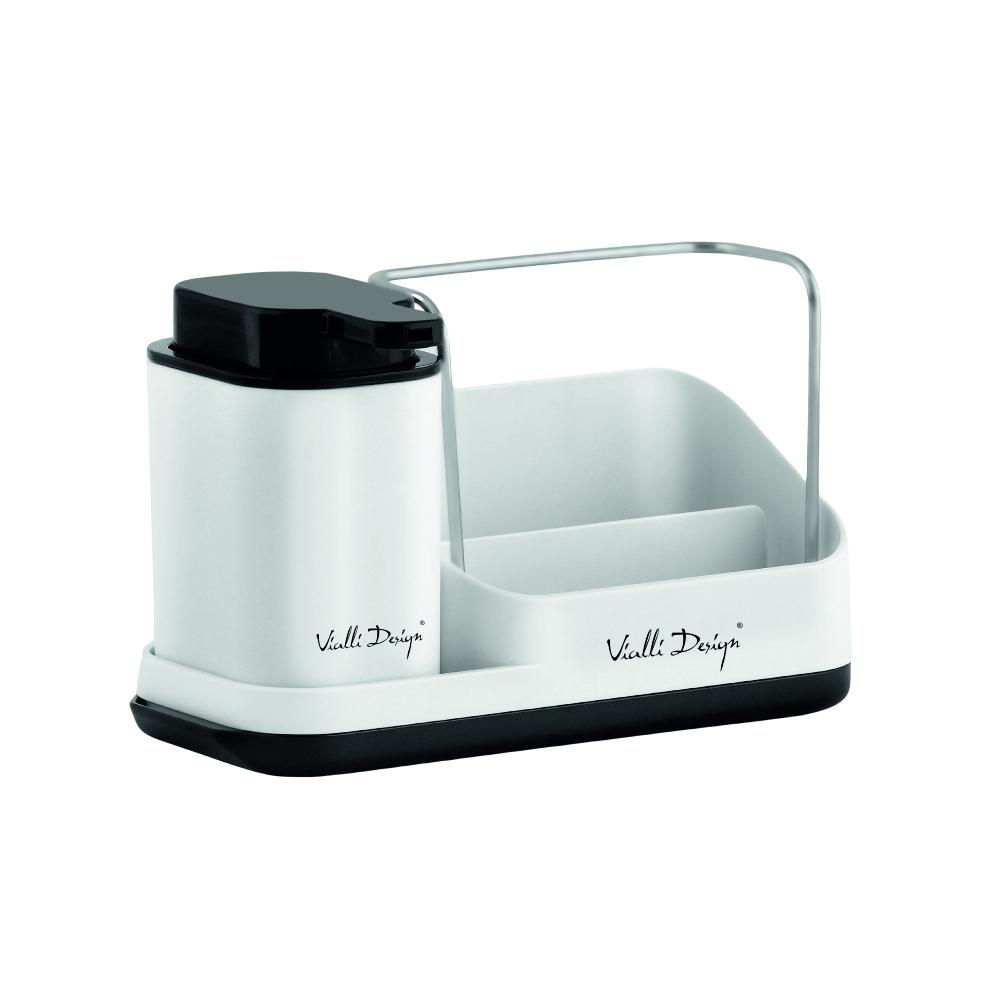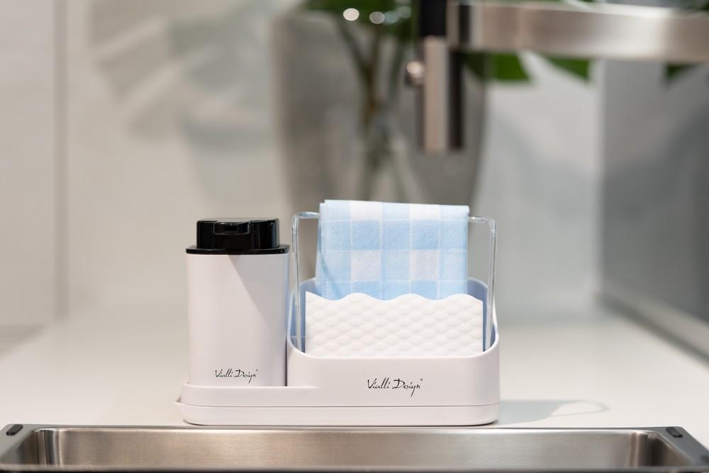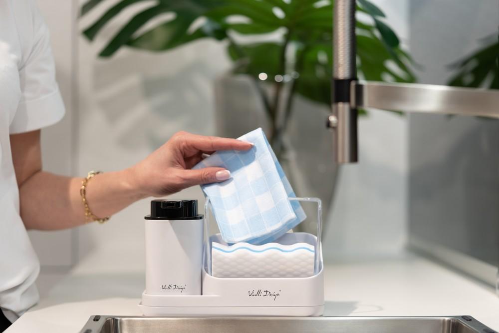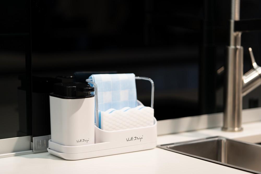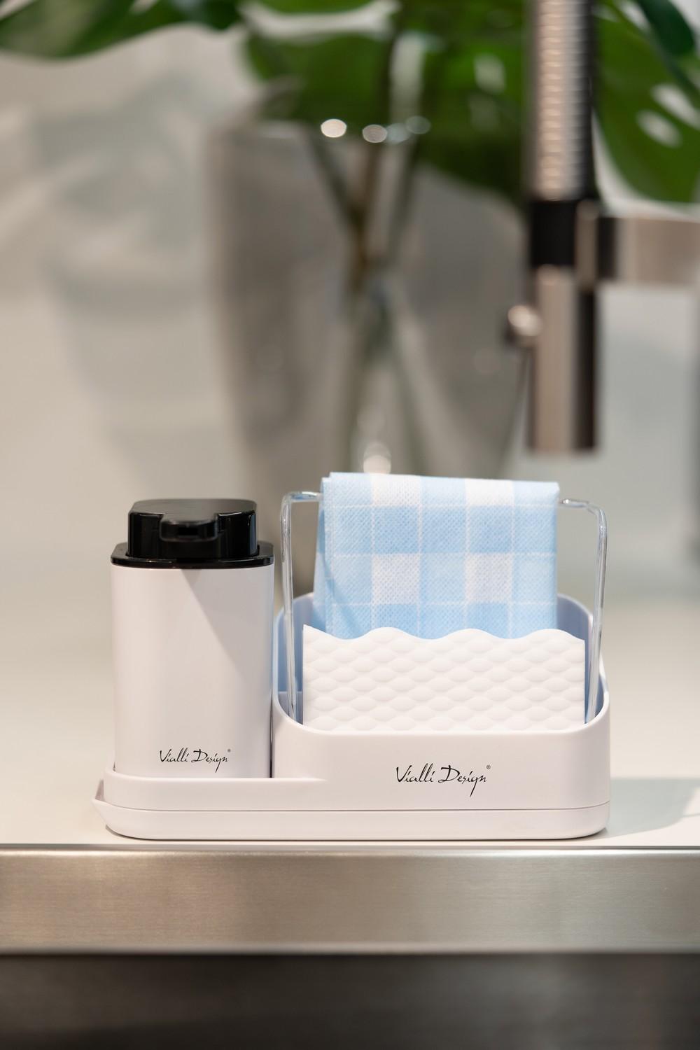Kuchyňský organizér vám pomůže vytvořit funkční místo u dřezu. Skládá se ze tří integrálních částí - dávkovače mycího prostředku, stojánku na houbičky a věšáku na hadříky. Sada je vyrobena z kvalitních materiálů a plast, který je hlavním stavebním prvkem tohoto doplňku, je plně odolný proti vlhkosti.