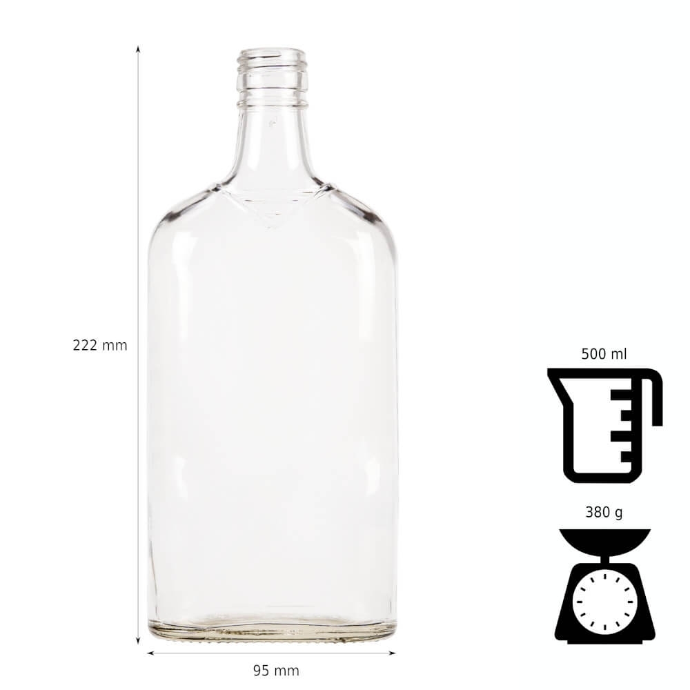 Elegantní skleněná placatka o objemu 500 ml je ideální volbou pro domácí lihoviny, likéry, pálenky nebo dárkové balení nápojů. Díky svému klasickému tvaru a kvalitnímu silnému sklu působí stylově a zároveň zajišťuje bezpečné skladování obsahu.