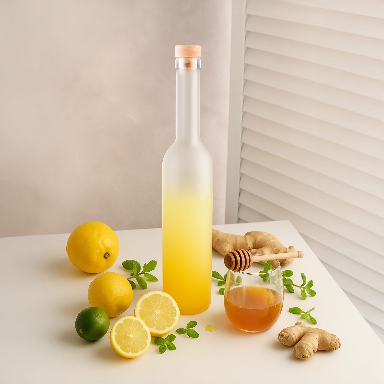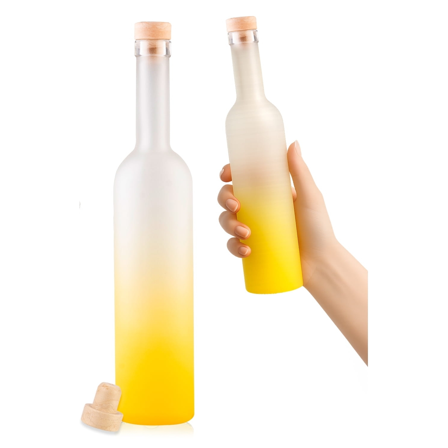 Elegantní sada 10ti skleněných láhví s matným saténovým povrchem a jemným žlutým přechodem zaujme na první pohled. Díky svému univerzálnímu objemu a pevnému sklu je ideální pro domácí likéry, oleje, šťávy i dekorativní použití. Součástí balení je syntetická zátka – bezpečné a praktické uzavření v rustikálním stylu.