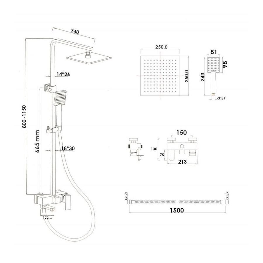 typ: nástěnná, dvouotvorová, s přepínačem s dešťové sprchovou hlavice 250x250mm a ruční sprchy,