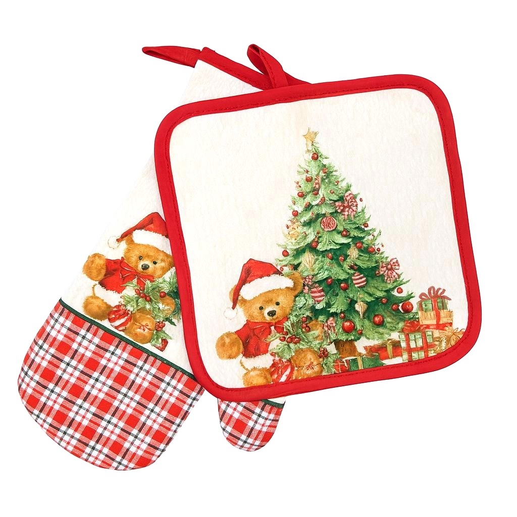 Set kuchyňské rukavice + chňapka s originálním vánočním potiskem jsou vyrobeny ze 100% bavlny. Rukavice i chňapka jsou vybavené poutkem.