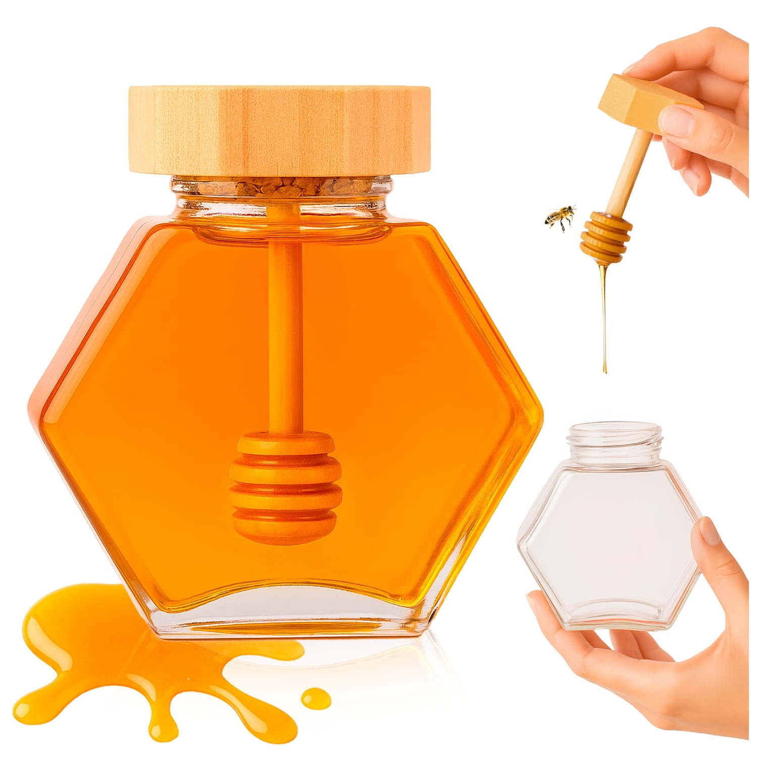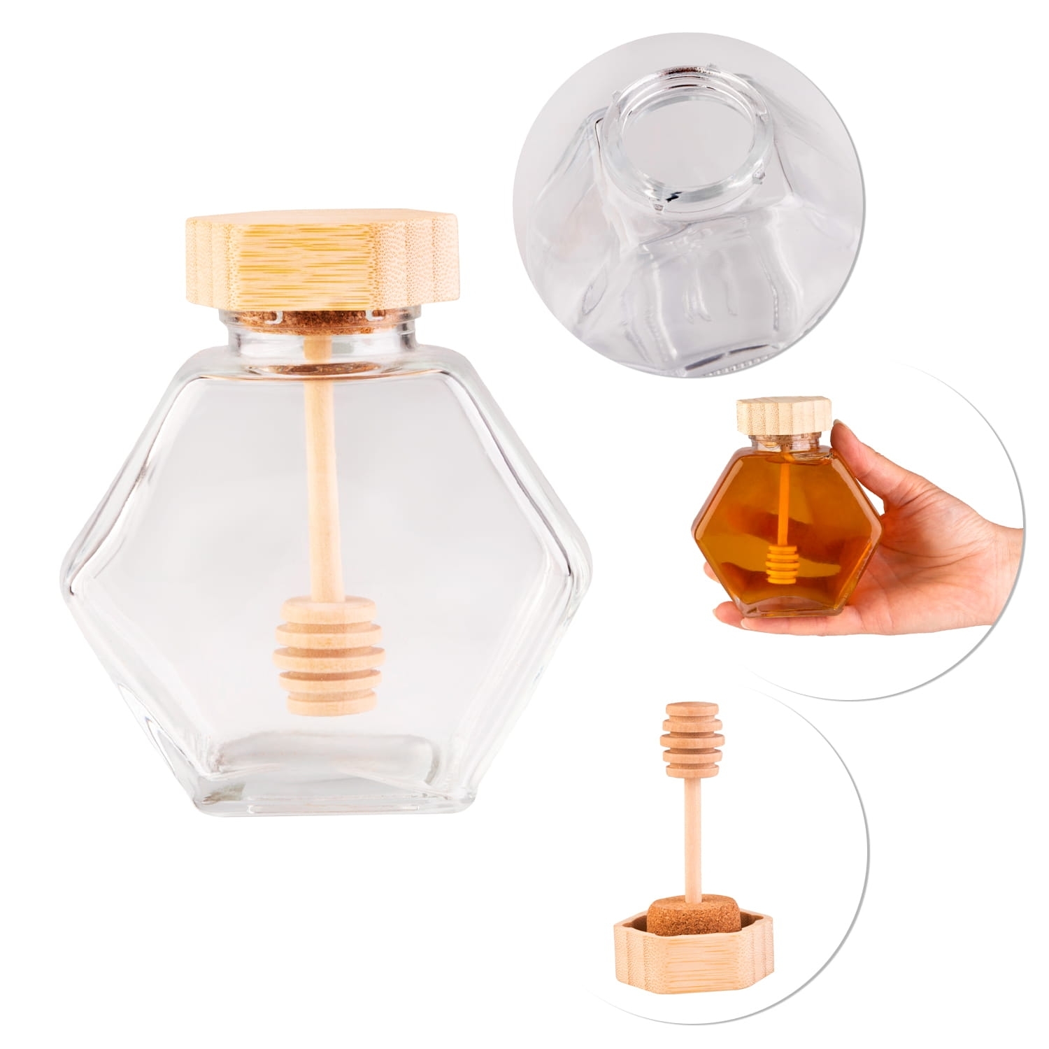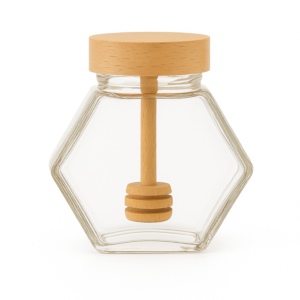 Praktická a elegantní sklenice na med o objemu 220 ml v originálním šestihranném tvaru s bambusovým víkem a integrovanou naběračkou je ideální pro servírování i skladování. Spojuje přírodní materiály, jedinečný design a vysokou funkčnost – stane se ozdobou každého stolu i kuchyně.