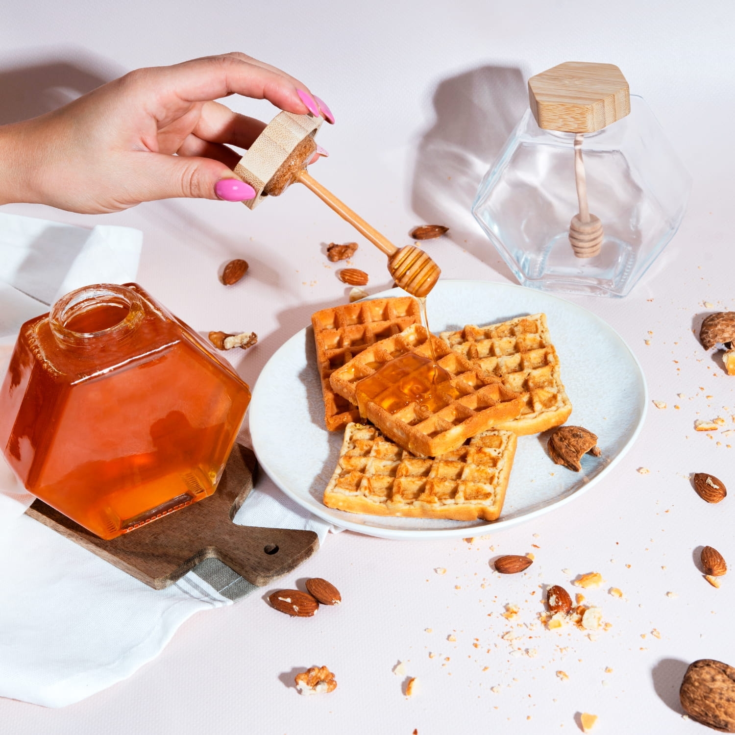 Praktická a stylová sklenice na med o objemu 380 ml v šestihranném tvaru s bambusovým víkem a odnímatelnou dřevěnou naběračkou je ideální pro servírování i skladování. Spojuje ekologické materiály, moderní design a vysokou funkčnost – stane se elegantním doplňkem každého stolu i kuchyně.
