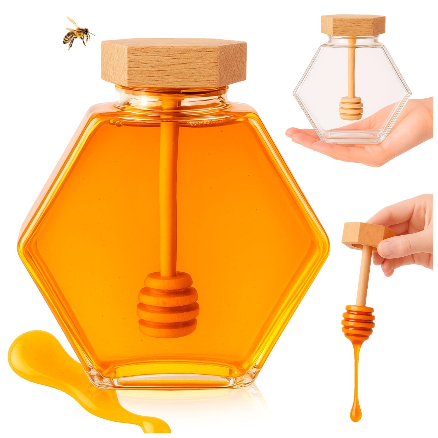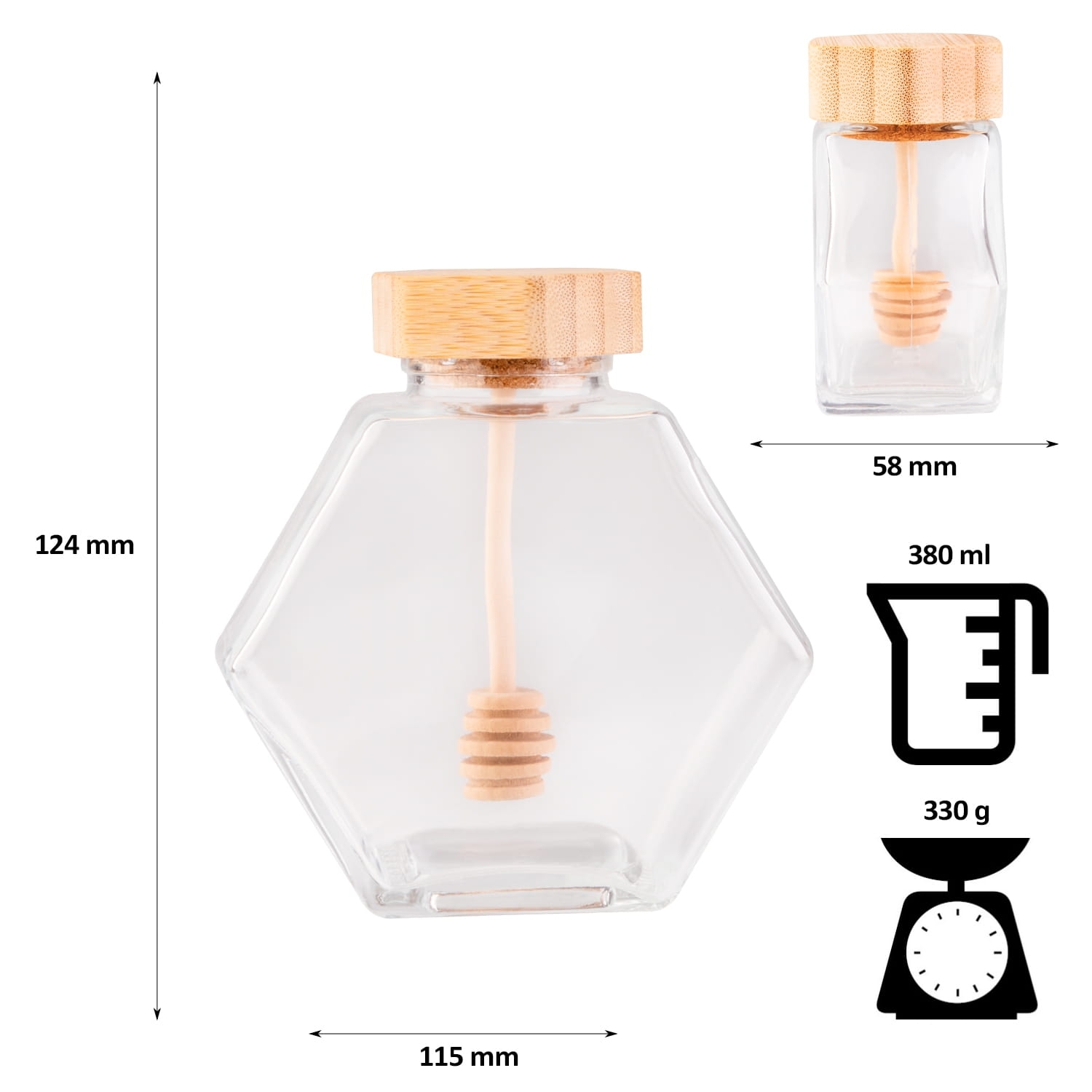 Sklenice je vyrobena z kvalitního průhledného skla, které umožňuje dokonale vidět obsah. Bambusové víko je vybaveno odnímatelnou dřevěnou lžičkou se spirálovým tvarem pro snadné nabírání medu. Díky objemu 380 ml je nádoba praktická pro skladování medu, džemů, sirupů, zavařenin nebo koření. Šestihranný tvar dodává sklenici jedinečný vzhled a působí esteticky při každodenním použití i při formálních setkáních.
