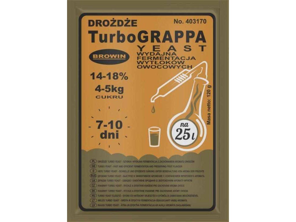 TURBO Vinné kvasnice Grappa jsou perfektní směsí kvasinek, živin a vitamínů pro rychlé kvašení. Doporučeno pro kvašení ovocných výlisků (jablko, hrozny, rybíz, hrušky a další). Umožní vám získat až 14-18% alkoholu za 7-10 dní. Získáte zvýšenou ovocnou vůni hotového nápoje.