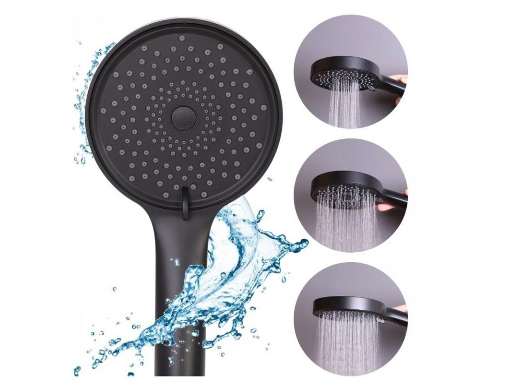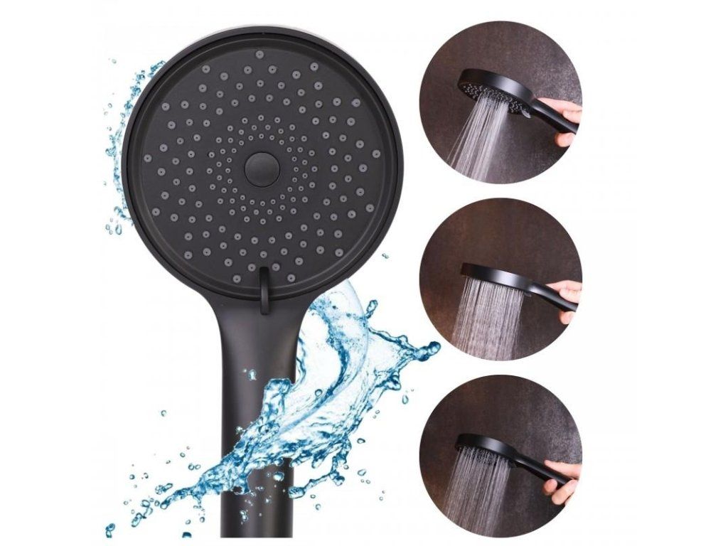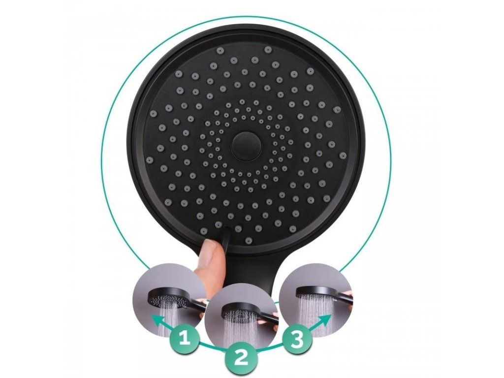 Sprchová hlavice Abel 59175 v elegantním černém matném provedení je ideální volbou pro moderní koupelny, kde se klade důraz na styl i funkčnost. Díky třem režimům proudu vody umožňuje přizpůsobit sprchování vašim aktuálním potřebám – od jemného relaxačního proudu až po intenzivnější oplach.