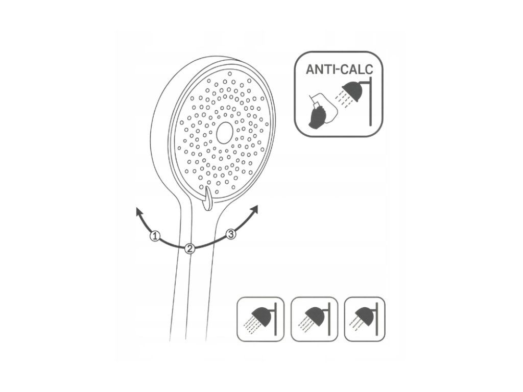 Hlavice je vyrobena z kvalitního a lehkého ABS plastu, který je odolný vůči poškození i každodennímu používání. Systém Anti-Calc účinně zabraňuje usazování vodního kamene, usnadňuje čištění a prodlužuje životnost výrobku. Univerzální připojení 1/2" zajišťuje snadnou instalaci a plnou kompatibilitu se všemi standardními sprchovými hadicemi, bateriemi a držáky.