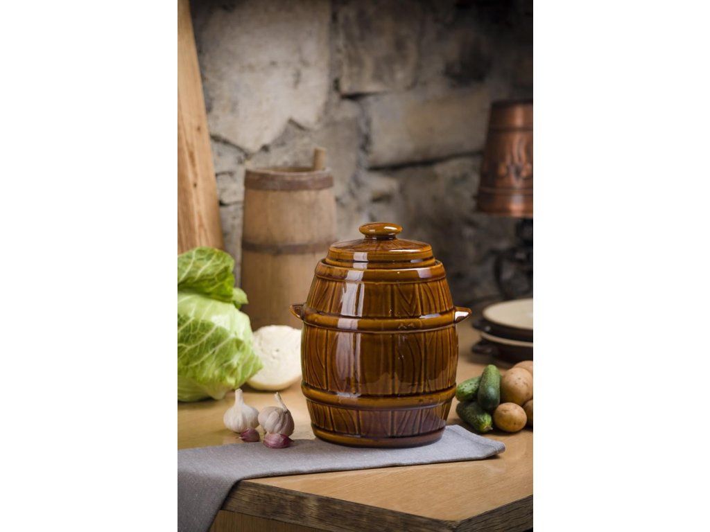 Skladování zeleniny v hermetických soudkách je osvědčenou a zároveň nejlepší metodou zachování její čerstvé vůně a dobré chuti. V zimě jsou zelí nebo nakládané okurky z keramické nádoby nenahraditelným zdrojem přírodních vitamínů.