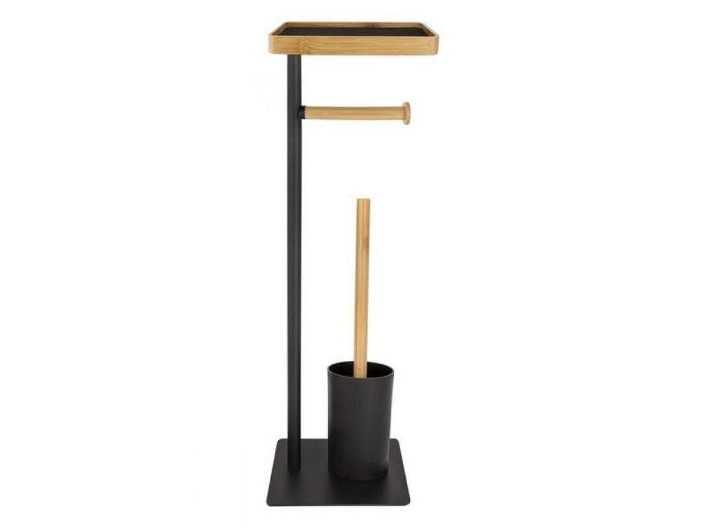 Stojan na WC kartáč s poličkou a držákem na toaletní papír je skvělou kombinací moderního designu a praktického příslušenství do koupelny. Stojan je z ocelového materiálu s černým lakováním a má dekorativní prvky z přírodního bambusu.