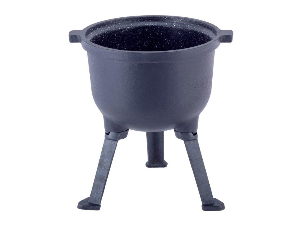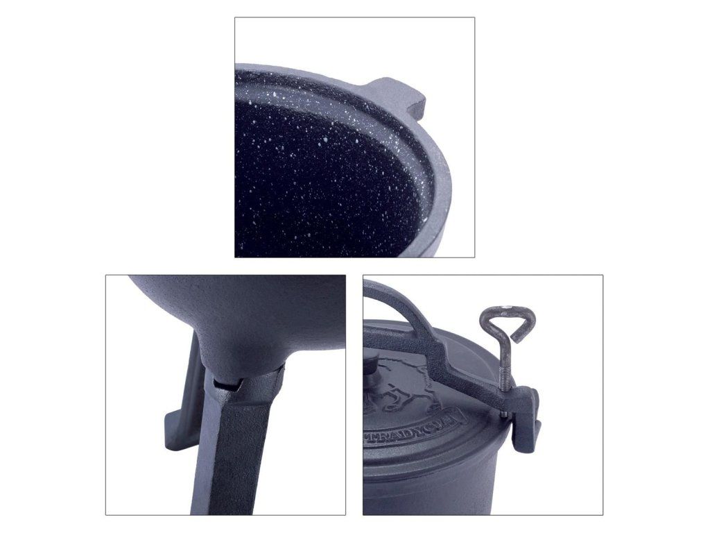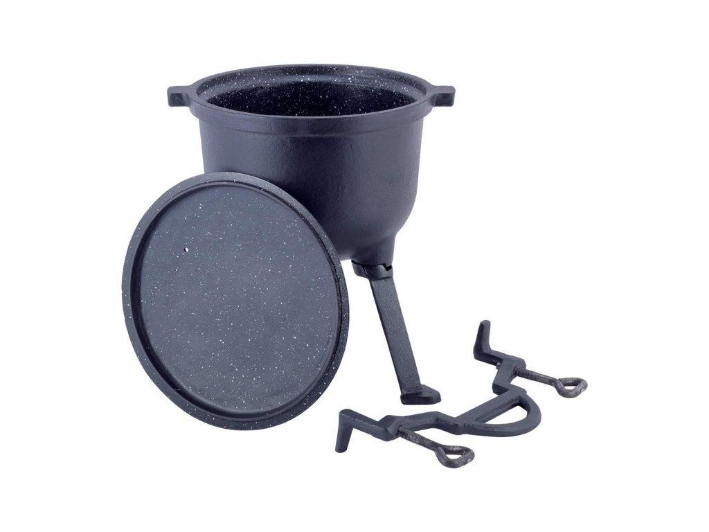 Ideální pro přípravu jídla na ohni, odolný proti oděru. Díky vnitřnímu mramorovému povlaku je riziko připálení pokrmů sníženo na minimum a čištění po použití je komfortnější. Na víku je otvor, který umožňuje odvzdušnění pro regulaci tlaku na bezpečnou úroveň. Litina je přírodní materiál, bez chemických přísad, dokonale vede teplo, které se rovnoměrně šíří po celé ploše kotle. Odšroubovatelné nohy a praktická rukojeť pro nošení nebo zavěšení.
